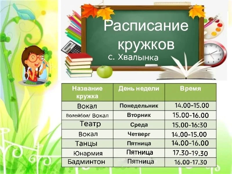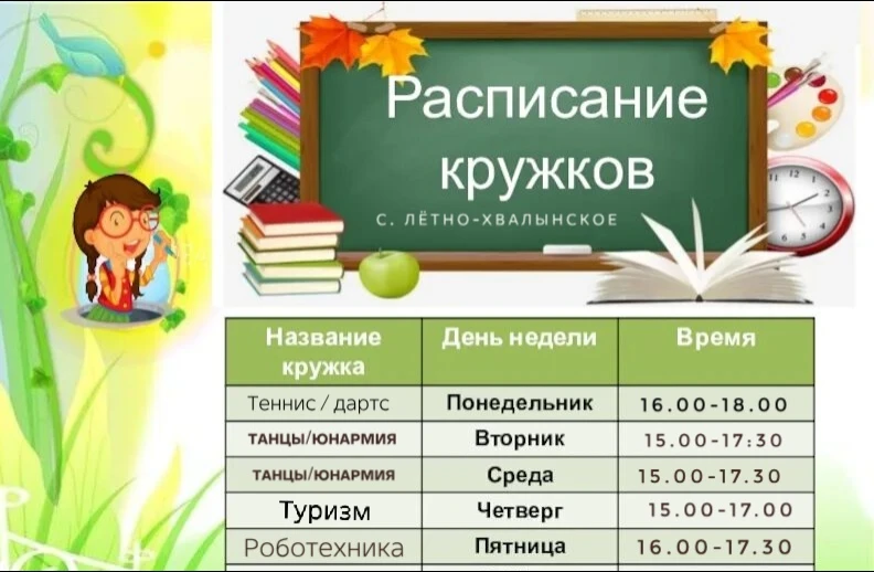 Расписание бесплатных кружков МБОУ “СОШ № 9” с.Хвалынка